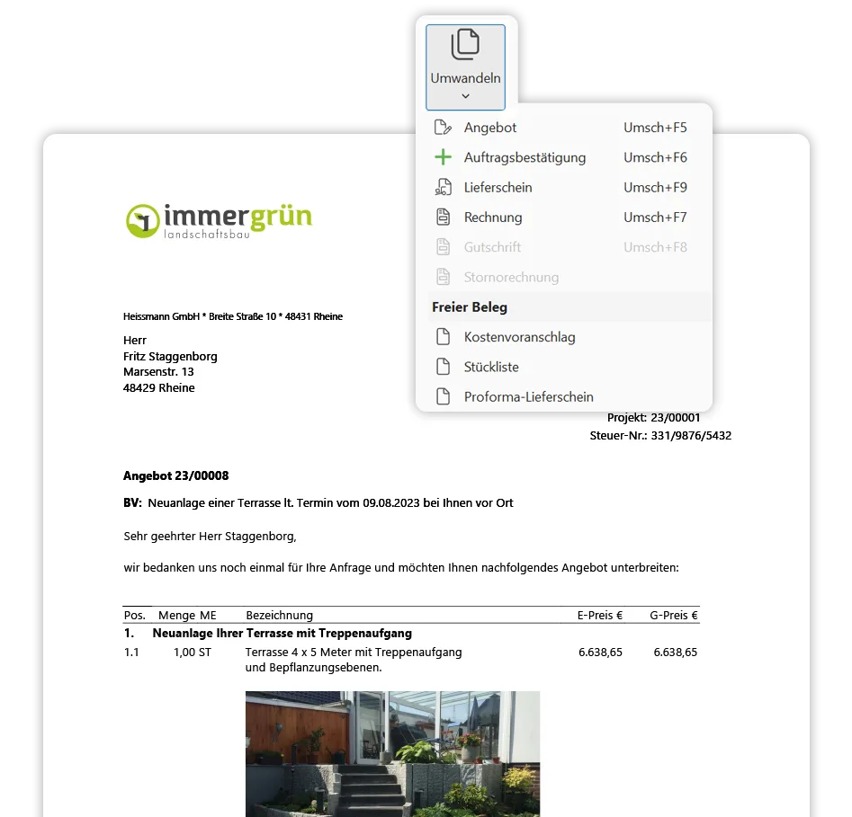 Darüber hinaus können Sie mit Hilfe des Formulareditors mühelos Ihre Geschäftspapiere individualisieren. Fügen Sie z.B. das Logo Ihres GaLaBau-Betriebs und einen Briefkopf ein. Dokumente wirken so direkt professionell und hinterlassen beim Kunden einen kompetenten Eindruck.
